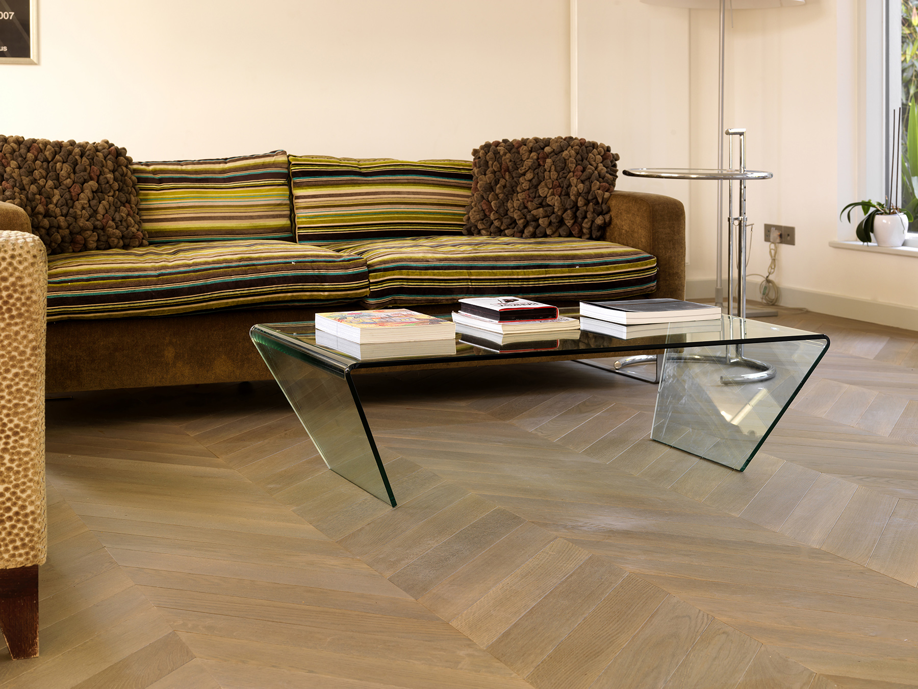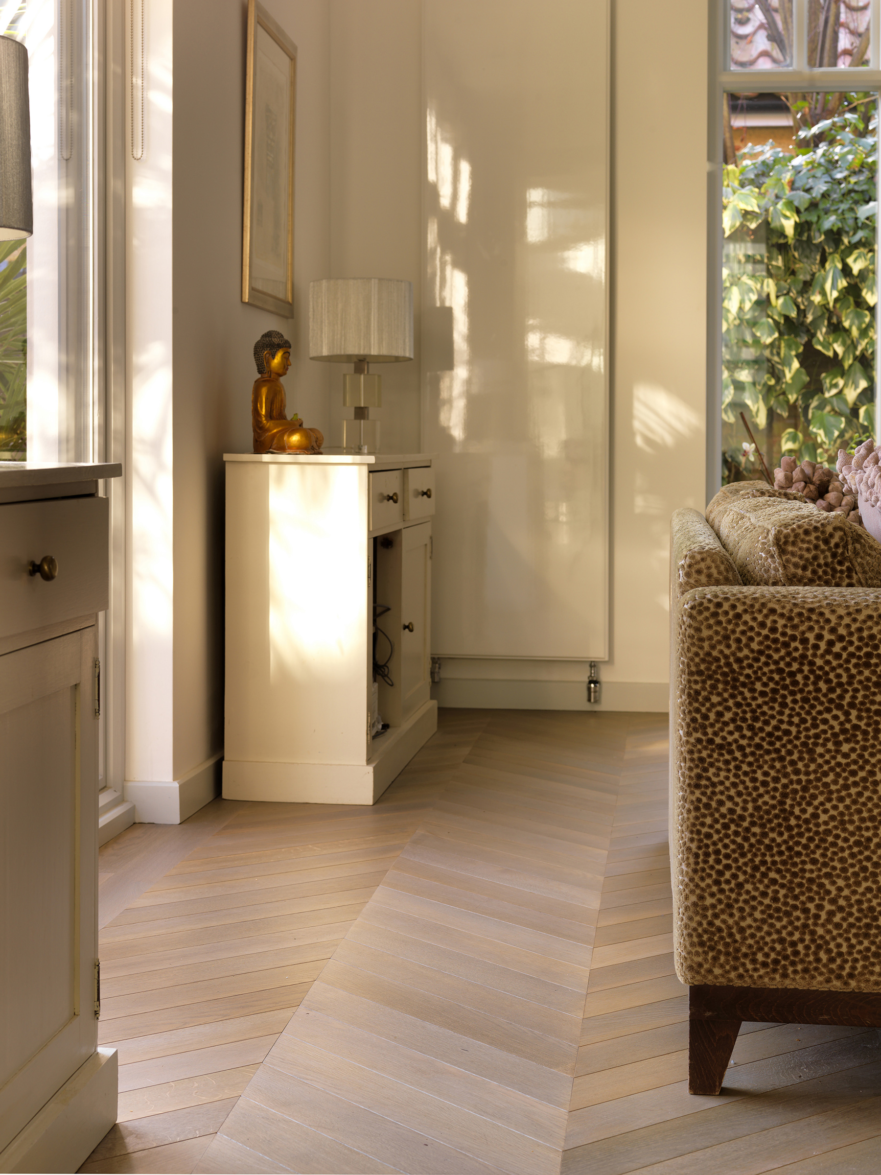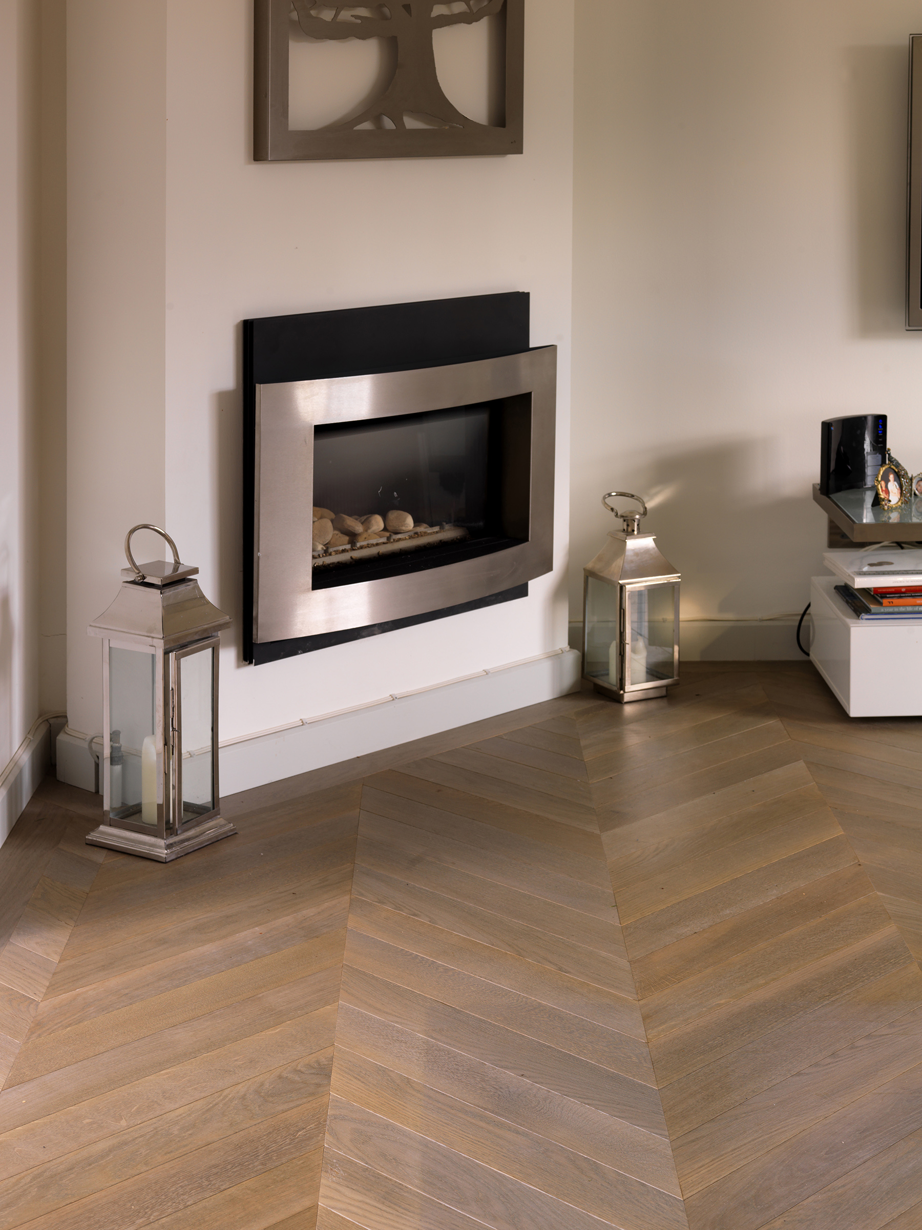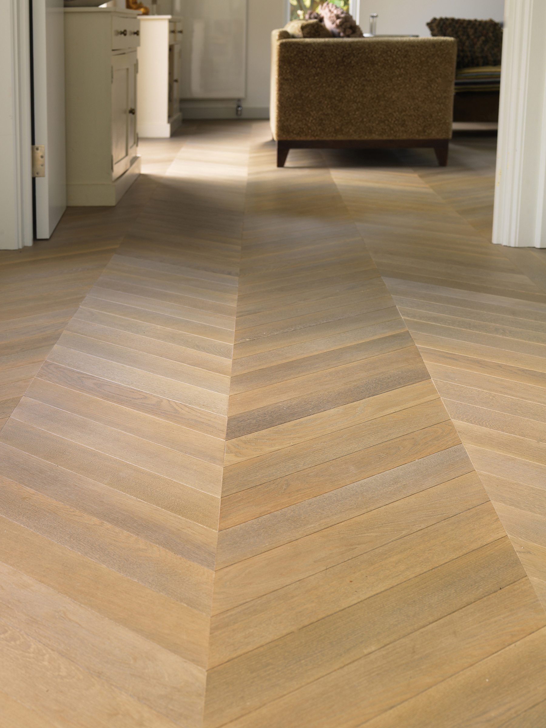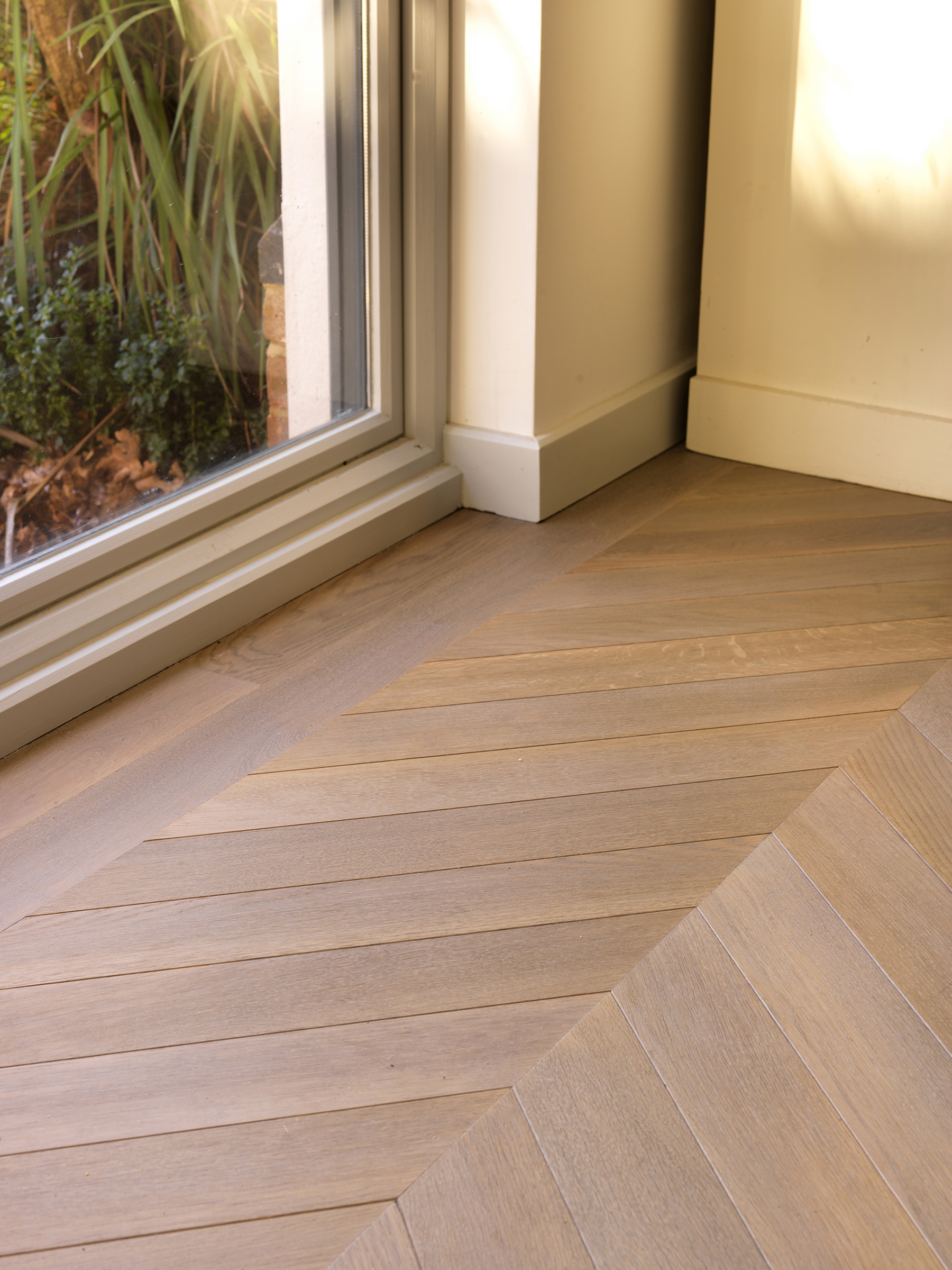 Bespoke oak parquet made and installed in chevron pattern.