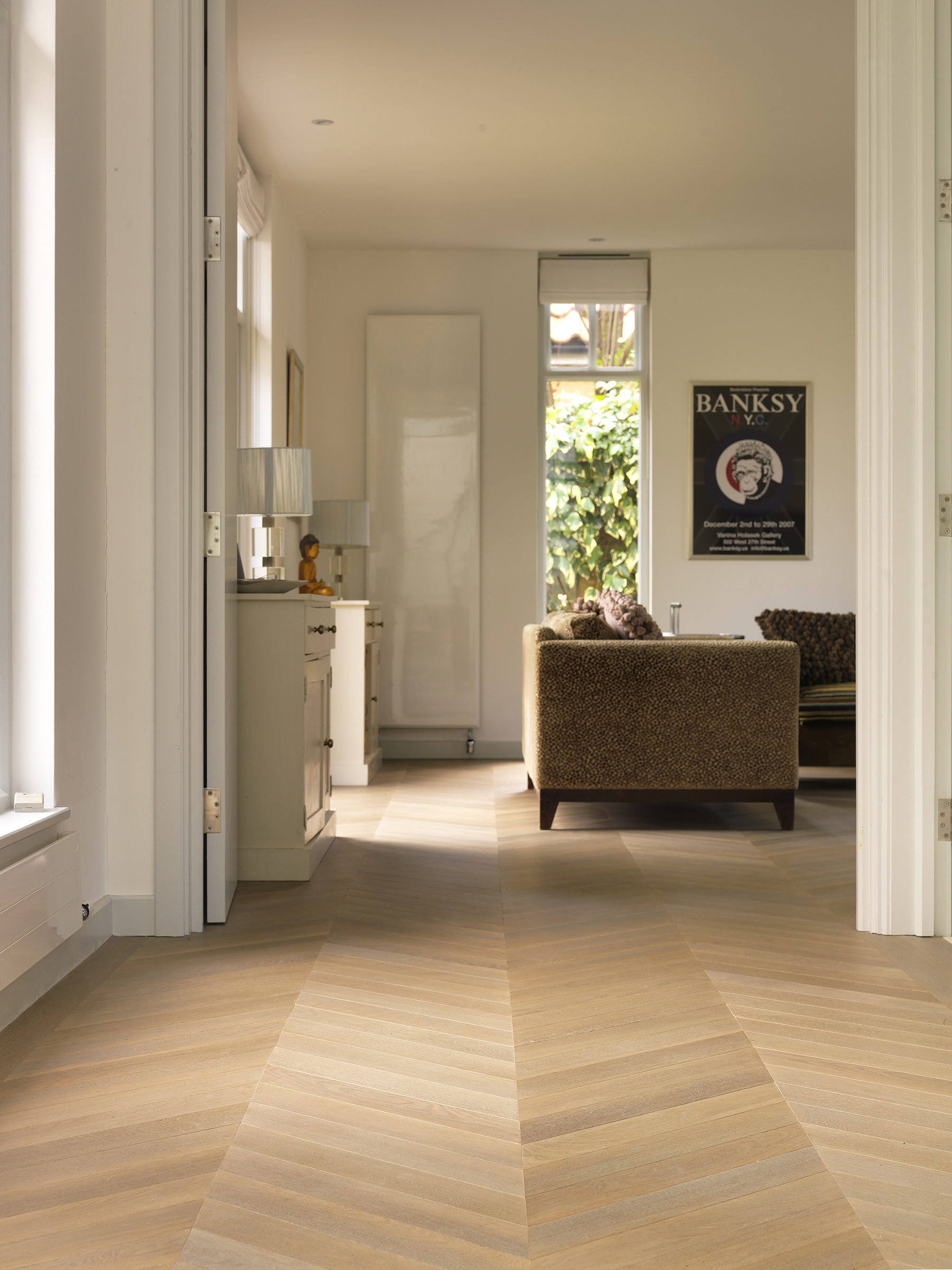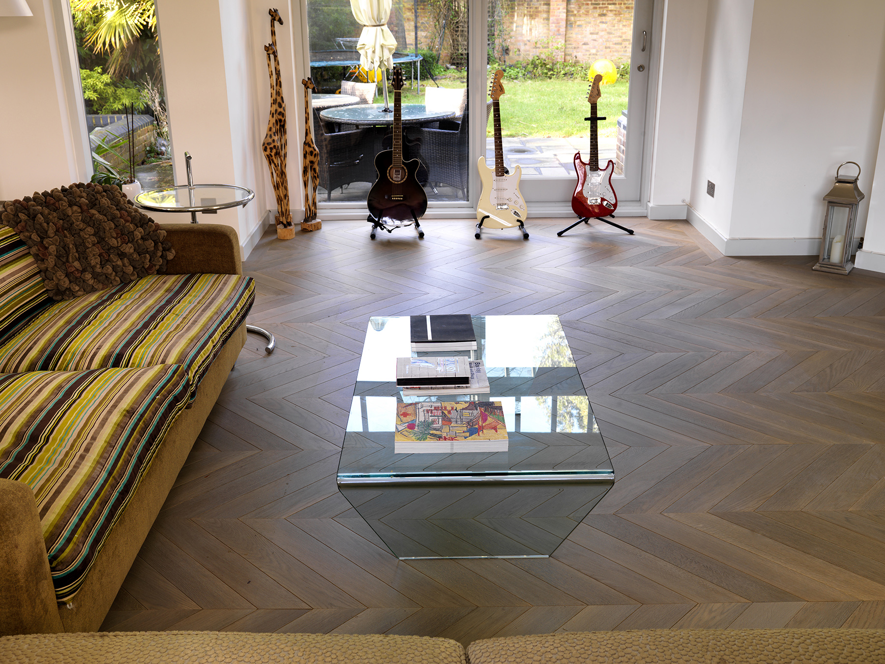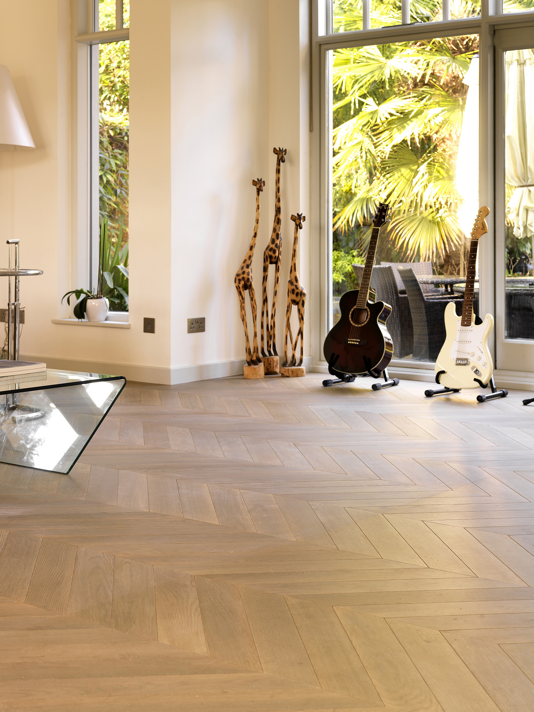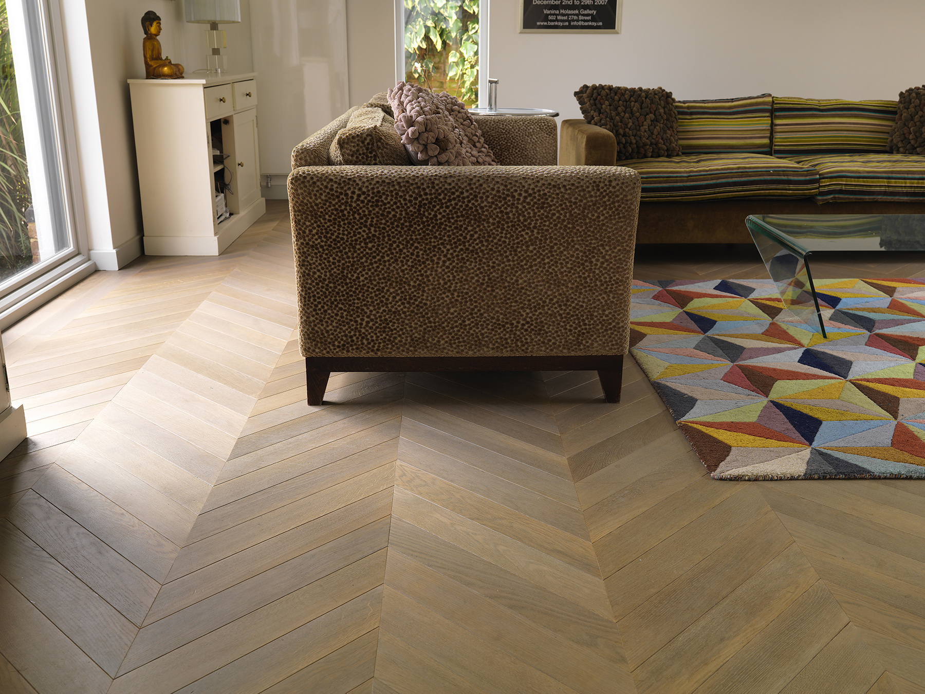 Bespoke oak parquet made and installed in chevron pattern.