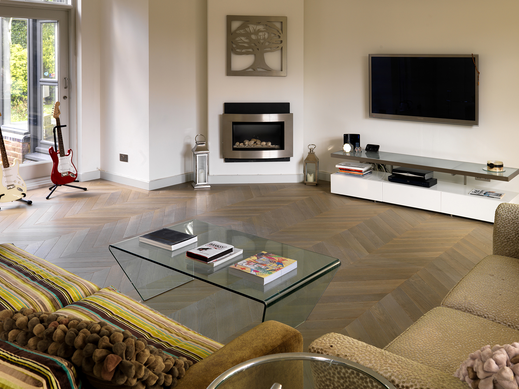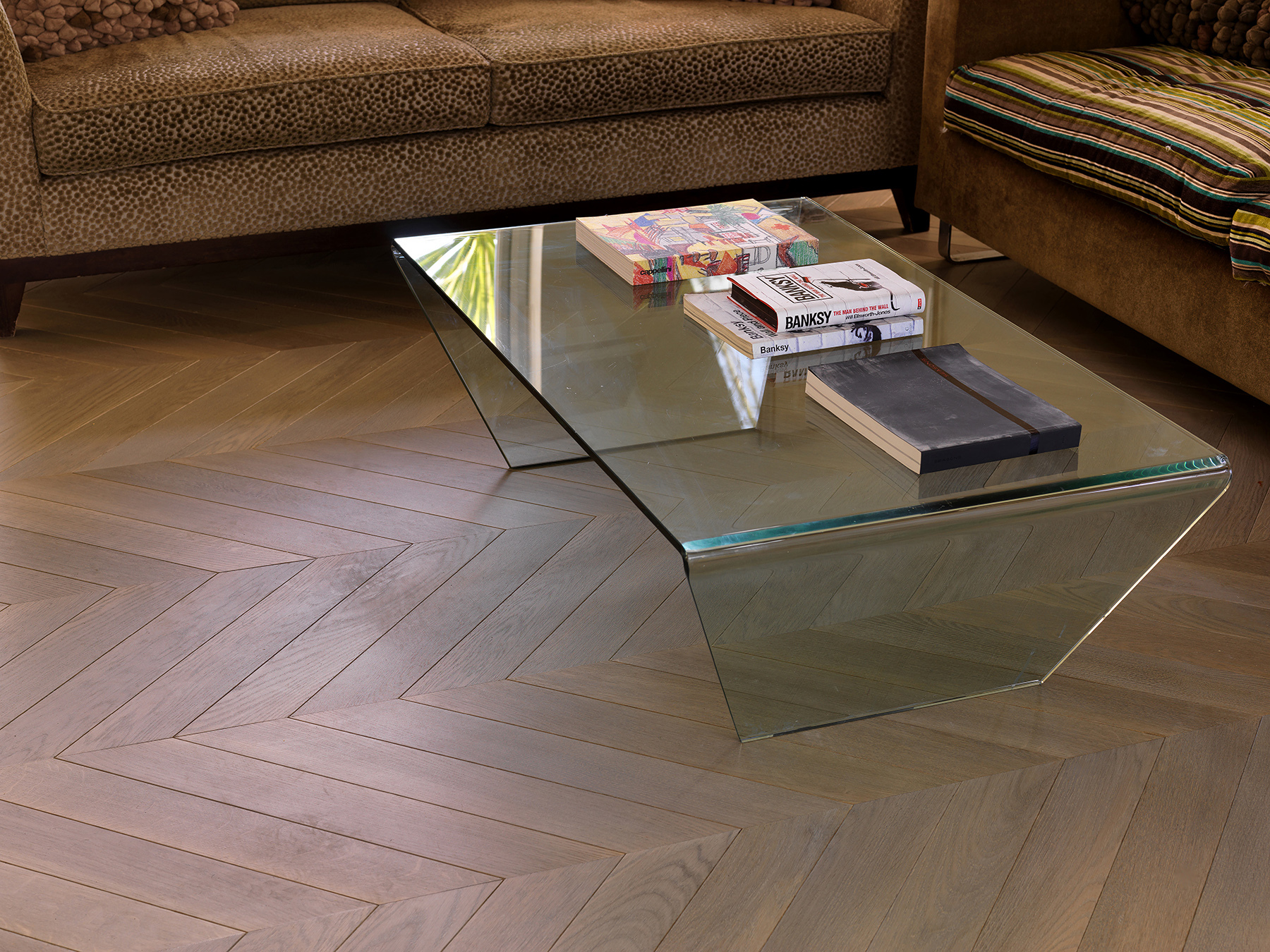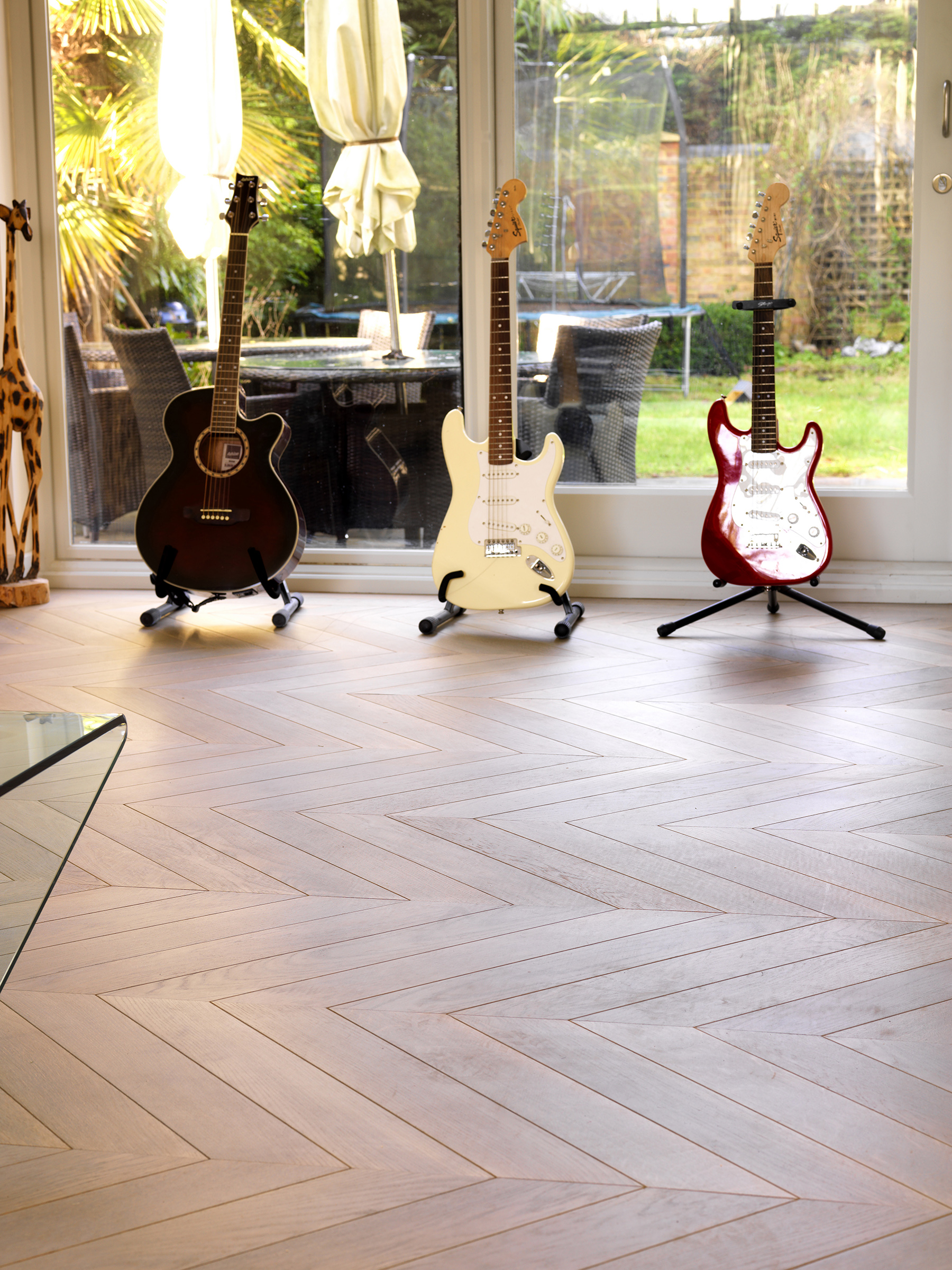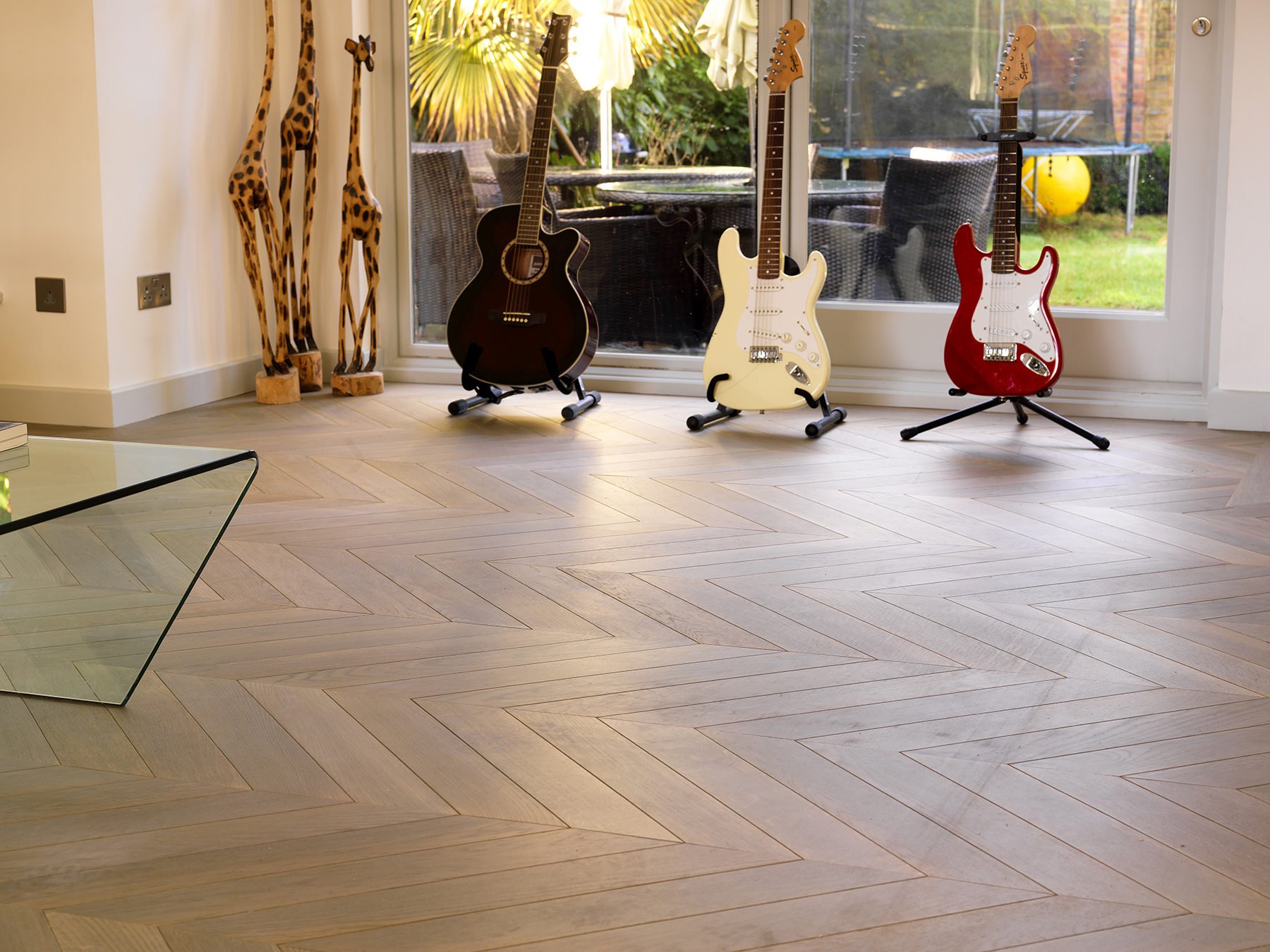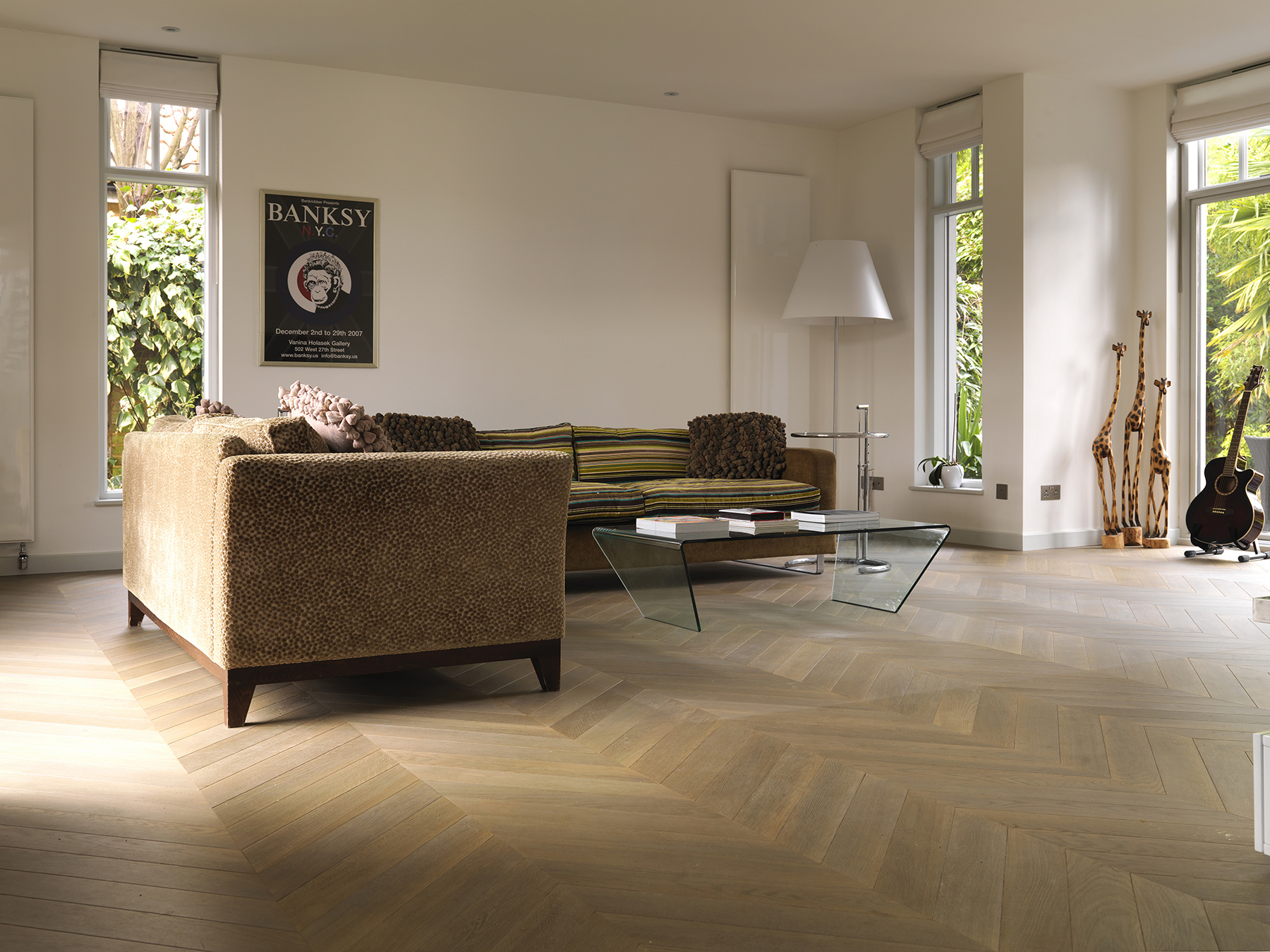 Bespoke oak parquet made and installed in chevron pattern.